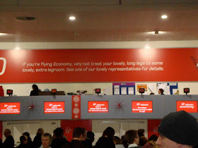 Se la foto fosse troppo piccola per leggere, vi riporto il testo del banner: "If you are flying Economy, why not treat your lovely, long legs to some lovely, extra legroom. See one of our lovely representatives for details".